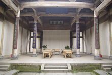前廳是整幢房子中最精華的部分,大門后面聳立著一幅威儀的中門,在中門“福”字的上方,鑲有一幅木雕“百子鬧元宵”圖,圖上雕刻著100個小男孩過元宵鬧花燈時的情景,這正是古代“多子多!眰鹘y(tǒng)觀念的生動寫照,“百子鬧元宵”圖兩邊的“商”字斗拱上則分別雕有四出《三國演義》的戲文,斗拱的上方雕有“南、北”財神,“南、北”財神的上方是閣樓護板,在此,汪定貴設計了“漁、樵、耕、讀”四根木雕立柱,分別代表了古代的四種職業(yè)。