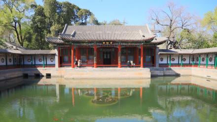 畫舫齋位于北海東岸,建于清乾隆二十二年(1757年),是掩映在山林中的一處獨(dú)立院落。前殿為“春雨淋塘”,中有水池,北為正殿“畫舫齋”。東西各有一處院落,東為“古柯庭”,西為“小玲瓏”。整個(gè)畫舫齋朱廊環(huán)繞,結(jié)構(gòu)精巧,環(huán)境別致,形似停泊在北海湖邊的一條大船,原引用歐陽(yáng)修的《畫舫齋記》而造其形,得其名。乾隆皇帝經(jīng)常到此游玩,光緒皇帝曾在此居住,慈禧太后也常來(lái)這里游宴、聽(tīng)評(píng)書。