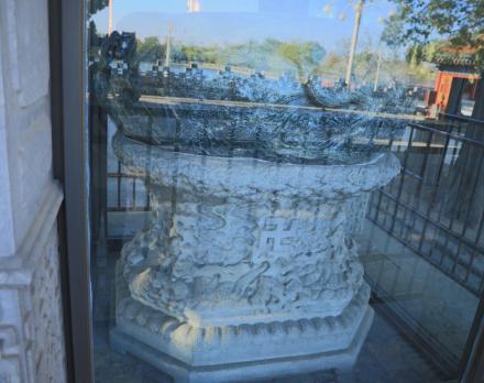 玉甕又稱“瀆山大玉!保谱饔谥猎辏1265年)?诔蕶E圓形,通高70公分,周長(zhǎng)493公分,重約3500公斤,周身浮雕海龍、海馬、海豬、海犀等出沒(méi)于波濤之中,栩栩如生。元世祖忽必烈曾將玉甕放置瓊?cè)A島廣寒殿中,傳說(shuō)曾用以盛酒大宴群臣。明代廣寒殿倒塌,玉甕失落民間。清乾隆十年(1745年)發(fā)現(xiàn)后,乾隆皇帝“令以千金易之,置承光殿中”,乾隆十四年(1749年)建玉甕亭,將玉甕陳設(shè)于亭中配以漢白玉雕花石座,命翰林四十人,各賦詩(shī)一首,刻于亭柱之上。