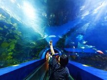 有金色的陽光、白色的沙灘、棲息在淺水海域的潮間生物。模擬生機(jī)勃勃的仿真海岸線長達(dá)48米,游客傾聽著輕柔的海浪,可以親手觸摸形態(tài)各異的海洋軟體動(dòng)物;孩子們?nèi)脒M(jìn)觸摸池中,能體驗(yàn)海水的感覺和與大海龜嬉戲的樂趣。