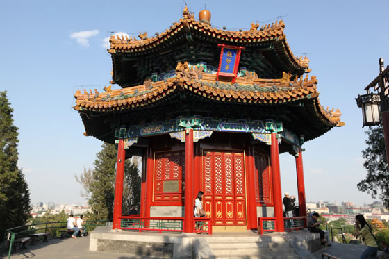 萬春亭:位于景山的中峰,中峰的相對高度為45.7米,是北京城南北中軸線上最高和最佳的觀景點。萬春亭位于景山最高處,建于乾隆十五年(1750年),是北京南北建筑中軸線的基點。被譽為北京中軸線上的制高點,京華覽勝第一處。亭高15.38米,平面呈四方形,為三重檐四角攢尖頂,上檐和中檐均為九踩三昂斗拱,下檐為七踩重昂斗拱,黃琉璃瓦覆頂綠剪邊,檐上有琉璃寶頂,建筑面積296.5平方米。萬春亭的彩繪稱為:旋子大點金龍錦枋心,這也是中國皇家等級最高的彩繪形式。萬春亭內(nèi)供奉著“毗盧遮那佛”,毗盧遮那佛也稱為大日如來佛,是釋迦牟尼佛的法身。毗盧遮那佛為密宗金剛界五方如來之首,在五方佛中代表法界體性智。亭中所供原佛像于二十世紀六十年代被損毀,重塑歸安后于2000年正式對外開放。