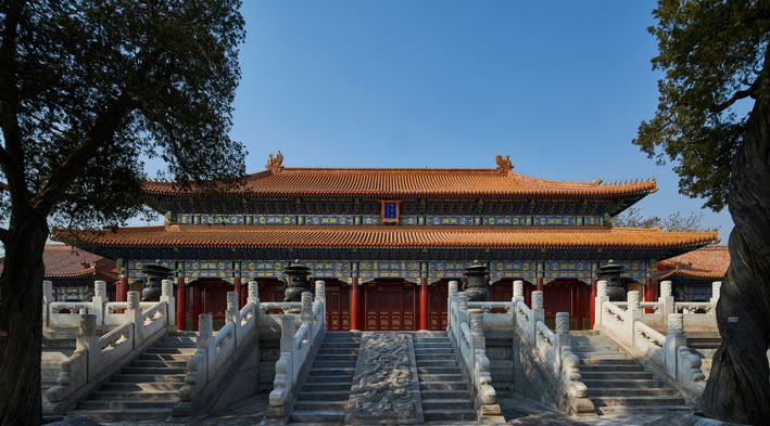 衍慶殿:在西。黃琉璃筒瓦歇山調(diào)大脊,面闊3間,進深1間,前后帶廊。重昂五踩斗拱,旋子彩畫,四周有石護攔。