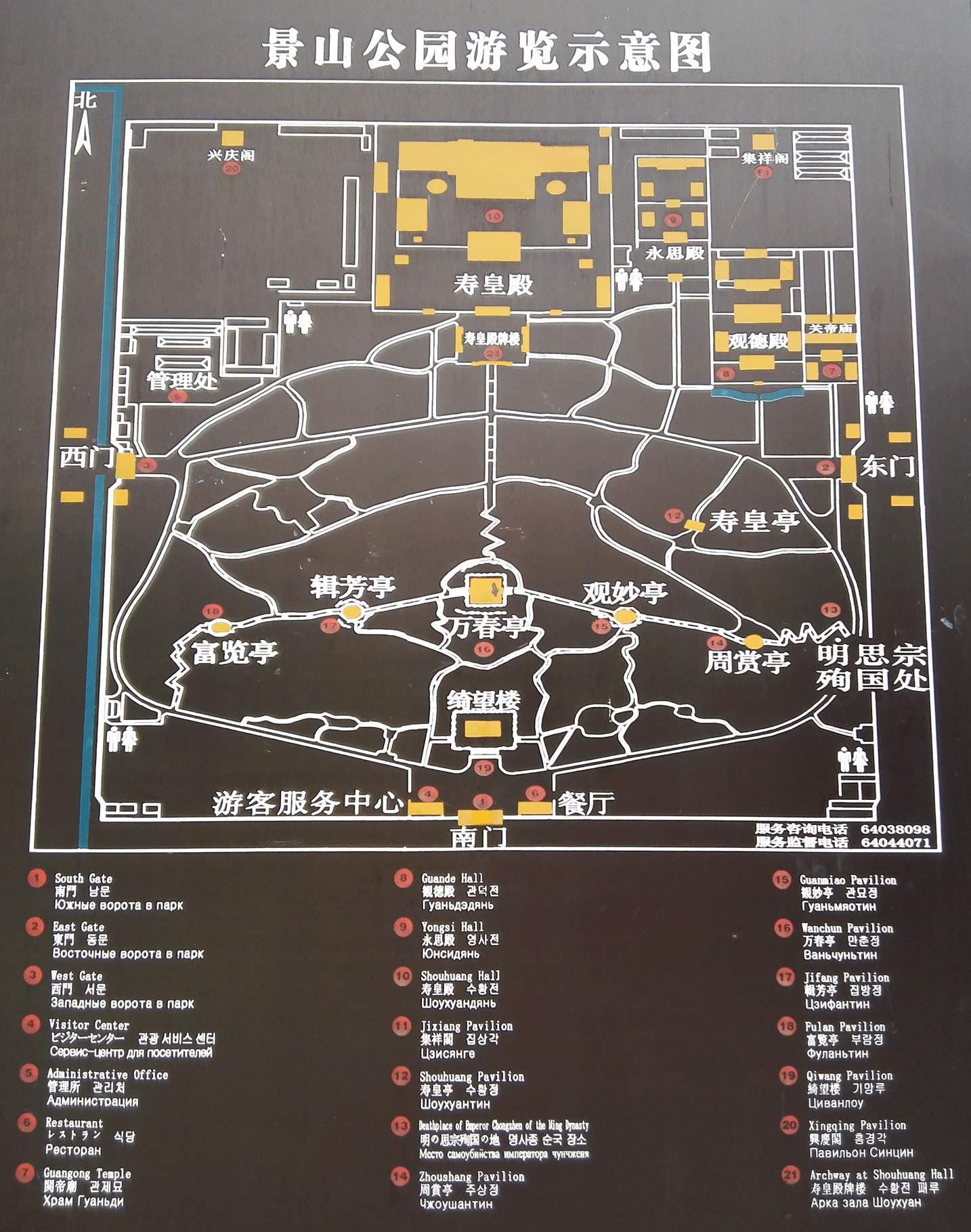 富覽亭:西側(cè)第一座亭?兹杆{琉璃筒瓦頂,紫晶色琉璃瓦剪邊,重檐圓攢尖頂。富覽亭建于乾隆十五年(1750年),為景山五方亭之一,與東側(cè)的周賞亭相對而建,兩座亭子的建筑形式和彩繪完全相同,為重檐圓攢尖頂,孔雀藍琉璃瓦覆頂,紫晶色琉璃瓦剪邊,亭高11.75米,建筑面積76.36平方米。富覽亭內(nèi)原供奉五方佛之一的不空成就佛,為鑄銅鎦金佛像。佛像于1900年(光緒二十六年)被八國聯(lián)軍劫去。不空成就佛是北方如來,又稱天鼓雷音佛、天鼓音佛、雷音王佛等名,在五智如來中代表 “成所作智”。 不空成就佛以大慈方便,使佛門修行者舍除懈怠貪欲,遠離一切煩惱,從而道業(yè)精進,以大智慧成就一切如來事業(yè)與眾生之事業(yè)。