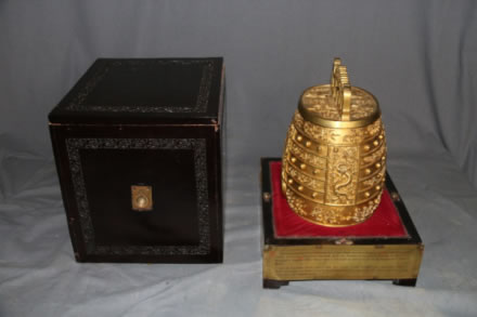 鍍金銀質(zhì)。體圓,直口平唇,短頸,鼓腹,兩側(cè)飾天官耳,腹下三足。爐口雷紋,通體刻八卦云鶴紋。爐蓋圓形,疊二層,上層鏤空乾、兌、震紋,后有香靠具缺刻。香靠具一付,從爐體內(nèi)壁靠具槽處插入爐內(nèi)。香靠具七出,鶴紋如意云頭,中間香插有圓框,以插圓形柱香。爐底陰刻楷書(shū)款“恒利銀號(hào)造京平足紋,重一百九十一兩五錢(qián),鍍金十五兩三錢(qián)”“光緒癸卯年制”。