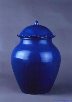 瓷質(zhì)。直口,平唇,短頸,豐肩,收腹,隱圈足。荷葉形蓋,子口,蓋上刻荷葉莖脈紋,螺鈕。器身外通施祭藍(lán)釉,器內(nèi)施白釉。純素。底書(shū)青花“大清光緒年制”六字雙行楷書(shū)款。