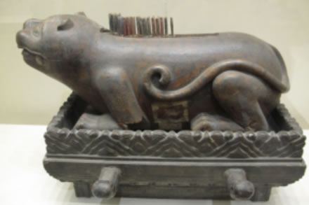 為中和韶樂(lè)樂(lè)器,木框革面,框旁飾六角鏤金盤(pán)龍二,臥置趺上。趺三層,通髹以金,上有垣鏤云紋。作樂(lè)時(shí)以左右手拊拍,每建鼓一擊,則搏拊?xún)蓳簦詾閼?yīng)合。