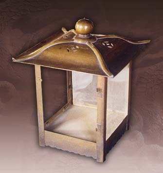 清末造。通高36.5厘米,檐方28厘米,足方20.6厘米。方形,四邊銅框,凹面玻璃心,一面為門(mén),銅框兩側(cè)、底云花裝飾,挑形活頁(yè)二,桃形吊環(huán),底邊有花紋,蓋頂穹隆形,四脊間飾四縷空金錢(qián)眼紋,頂飾圓尖鈕。陳設(shè)于祭壇正位前和臺(tái)階上,用于祭祀時(shí)照明。