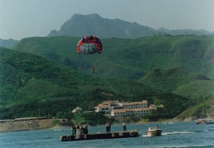 由泰國引進,跳傘平臺設在湖中,長40米,寬25米,總面積1000平方米。平臺浮在湖面上,由鐵錨固定在湖心。傘衣有兩種,可以根據(jù)游人的體重大小分別選用。游人在跳傘之前,平臺上穿好救生員和傘衣,傘衣由兩條高強度尼龍繩與傘和快艇相連,在快艇的高速牽引下,傘張開把人帶至空中,最高可達50米。隨著快艇的方向和速度,傘在空中時高時低,迂回曲折,在藍天碧水之間翱翔,湖區(qū)景色盡收眼底.
