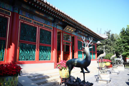 堂前有慈禧乘船的碼頭“樂壽堂”黑底金字橫匾為光緒手書。樂壽堂庭院內(nèi)陳列著銅鹿、銅鶴和銅花瓶,取意為“六合太平”。院內(nèi)花卉植有玉蘭、海棠、牡丹等,名花滿院,寓“玉堂富貴”之意。