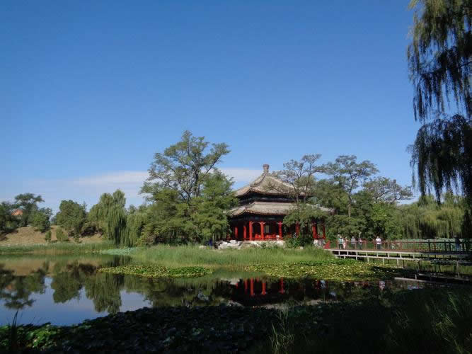 圓明三園的湖岸、池畔、溪濱,皆以垂柳為主。后湖四岸、福海周圍、南湖內(nèi)外,均遍植柳樹;北遠(yuǎn)山村至芰荷香,水溪曲折穿萬柳;綰春軒,一樹楊柳滿院陰;雙鶴齋和深柳讀書堂,古柳籠堂合圍抱。