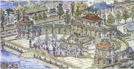如園是依照南京瞻園的樣式來建造的。此園有獨(dú)特的假山和土石,比瞻園還要大。如園的勝景位于東邊,里面的大池塘把北邊的殿堂和南邊的樓閣劃分開來。在池塘的東邊聳起一座七米高的人造山丘,在山腳下的兩側(cè)和臺階頂端有多座亭子,在臺階上有一個(gè)方向可以看到長春園,而另一面就看到南邊墻外的郊野景色,在臺階下是數(shù)以百計(jì)不同顏色的珍貴牡丹。在池塘的西邊有很多假山與洞穴,在這座假山的頂端建造了清瑤榭,面對著含碧樓。一座六角形涼亭的后面可見惟綠軒,清瑤榭的北面是七楹寬的延清亭,榭西是含翠軒。從這座殿堂的涼臺上北望,可以看到600米外的湖泊和山丘,因此這座小庭園雖然孤立在大范圍之內(nèi),卻進(jìn)一步善用了“借景”的技巧。
