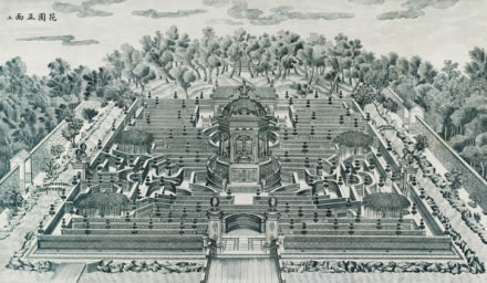 圓明園的位置在掛甲屯的北面,距暢春園約一里多路,即今北京大學(xué)的北邊,清華大學(xué)以西。康熙時(shí)的圓明園,里面有前湖、后湖等,其內(nèi)建有“牡丹臺”“天然圖畫”等園景。當(dāng)時(shí)圓明園還是一座藩賜園,規(guī)模不能超過皇帝的暢春園,所以建景不多,名聲也不大?珊髞黼S著乾隆皇帝的登基,清王朝的盛世的到來,在其多年陸續(xù)擴(kuò)建中,終于成為中國最宏偉的皇家園林。