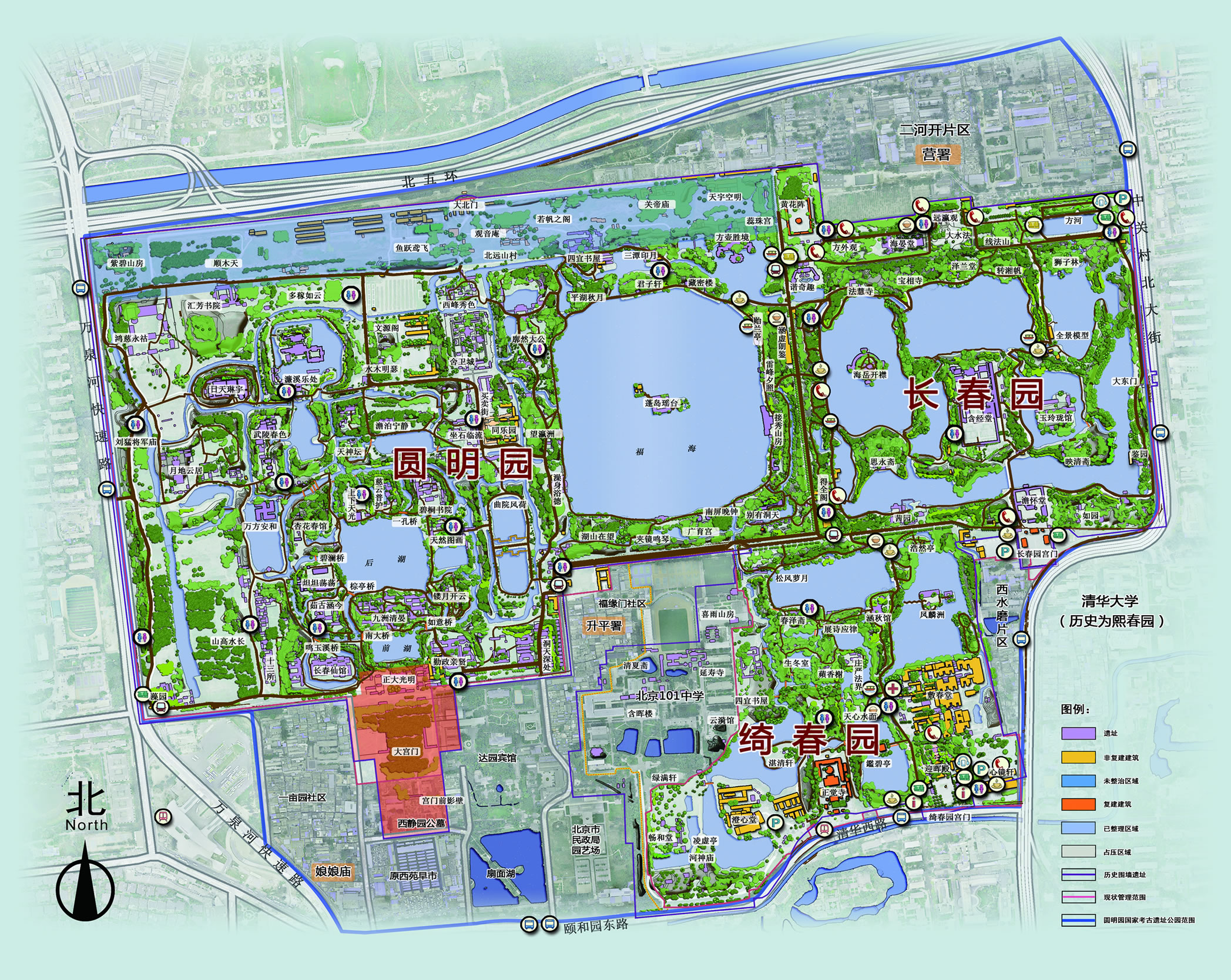 萼輝園(綺春園前身)位于暢春園的東北方向,其具體位置大致在御園北側(cè)的索戚畹園(即后來的澄懷園)以東,淑春園以北、熙春園以西,也就是綺春園(全盛規(guī)模時(shí)期)的西南部,這個(gè)區(qū)域大致為現(xiàn)一零一中學(xué)所在地。