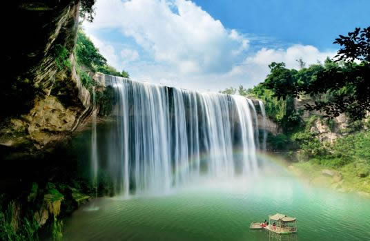 萬州大瀑布又稱青龍瀑布、甘寧瀑布。位于核心景區(qū)青龍河中段,寬151米,高64.5米,單掛面積9739.5平方米,為迄今發(fā)現(xiàn)的亞洲面積最大的單掛瀑布。瀑布長(zhǎng)年浩浩蕩蕩,凌空飛瀉,其勢(shì)如千軍萬馬橫空出世,氣吞萬象。在陽光的照射下,瀑珠時(shí)時(shí)生輝,瀑霧處處成虹。隨著水勢(shì)大小、陽光強(qiáng)弱、觀賞角度的變換,彩虹的位置、形態(tài)、色澤還會(huì)發(fā)生奇異的變化,形成“飛瀑斜虹”“臥波長(zhǎng)虹”“雙曲彩虹”“跨岸飛虹”“水簾霓虹”“飲洞巨虹”等美景。