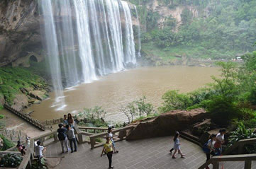 水簾洞位于瀑布下方,由整塊的巨巖組成。巨巖由砂巖青石構(gòu)成,面積有上萬平方米。水簾洞內(nèi)能以360度的全景視角觀賞到大瀑布“飛流直下三千尺,疑是銀河落九天”的恢宏氣勢(shì),體驗(yàn)與瀑布親密接觸的清爽,領(lǐng)略春雨瀟瀟、秋雨綿綿、夏雨磅礴的四季風(fēng)雨情致,有奇妙的季節(jié)穿越之感。