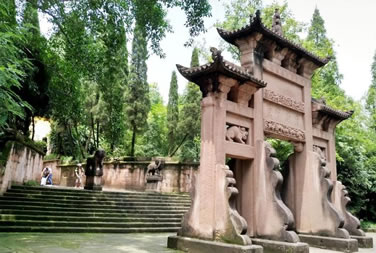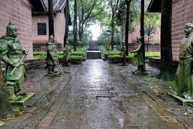 忠義祠位于護(hù)國寺右側(cè),與寺內(nèi)藥師殿僅一墻之隔,有門洞與護(hù)國寺相通,也可從護(hù)國寺右側(cè)小道進(jìn)入。始建于明弘治七年(1494年),原名“王張祠”,祀王堅(jiān)、張玨二將忠烈。明弘治十二年(1499年),合州知州宋琢見“王張祠”簡陋而集資整修。明正德十二年(1517年),合州知州佘崇鳳刻石立碑并培修祠宇。清初,“王張祠”遭兵亂,片瓦無存。清乾隆二十四年(1759年),合州知州王采珍重修,立余玠、王堅(jiān)、張玨、冉琎、冉璞5位牌位祀祭,改祠名為“忠義祠”。后歷經(jīng)培修。忠義寺整座建筑由正廳、耳房和左右?guī)拷M成,采用均衡對稱式,在縱軸線主要建筑物相對對峙,構(gòu)成大門進(jìn)出的三合院。整座庭院東西寬20米,南北縱深30米。進(jìn)入石坊形大門是一個(gè)院壩兩面的廂房,拾級而上至正廳。迎面高懸“忠義千秋”金字巨匾,匾下祭臺(tái)上排列余玠、王堅(jiān)、張玨、冉琎、冉璞牌位。祭臺(tái)正面有祝文:“維神才兼武,志秉忠貞。畫地成城,據(jù)形勝而保蜀土;協(xié)力戰(zhàn)守,遺魚餅以退元戎。忠誠貫日星,先后相繼;大節(jié)凌霄漢,古今照臨。茲屆仲春修祀典,肅陳籩豆,伏維來歆。尚饗!睆d堂楹柱有華國英撰寫的對聯(lián),上聯(lián)“持竿以釣中原,二三人盡瘁鞠躬,直拼得蒙哥一命”;下聯(lián)“把盞而澆故壘,十萬眾披肝瀝膽,竟不圖王立二心”。忠義祠內(nèi)有宋孝宗時(shí)期碑文4塊,宋光宗時(shí)期2塊,宋寧宗時(shí)期5塊,乾道年間以后22塊,其中記錄釣魚城之戰(zhàn)史跡的12塊。