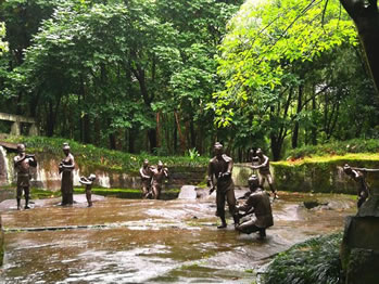 采石場遺址位于釣魚城基本陳列一展廳正對的游步道頂端。為讓游人了解釣魚城筑城之艱難與古代民眾付出之艱辛,遺址還原了700多年前釣魚城筑城采石的勞動(dòng)場景,其中的人物雕塑大小比例與真人一致。他們有的手握鋼釬在撬石頭,有的拿著手錘打鏨子,有光著胳膊抬石頭,同時(shí)還有前來送水的婦女與小孩,每個(gè)人物惟妙惟肖,充滿濃郁的生活味。