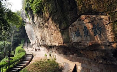 陳毅摩崖詩題刻位于城南始關(guān)門(清代修建)外右側(cè)近百米處的峭壁上。1927年2月,陳毅與3師政治部同事范英士登臨釣魚城觀看釣魚城歷代碑記,陳毅即興口占四句詩:“釣魚城何在,遙望一高原。壯烈英雄氣,千秋尚凜然!