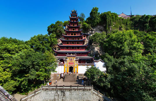石寶寨古建筑群于明萬歷年間始建,景區(qū)總占地面積5.4萬平方米,建筑面積3486平方米。南臨長江航道,西北側(cè)有后溪河和尖山子,東北與新石寶鎮(zhèn)相望。寨樓山頂海拔211.04米,三峽工程蓄水到175米水位后,石寶寨四面環(huán)水,在巨型圍堤環(huán)繞下,石寶寨成為長江一處大型江中“盆景”,享有長江“小蓬萊”美稱。寨樓依山而建,飛檐展翼,極為壯觀。閣樓共12層,通高56米。寨頂有古剎天子殿,臨巖筑墻、殿宇巍峨、蔚為壯觀,還有文物陳列室和鴨子洞、流米洞、石寶姑娘、老鷹找路等。