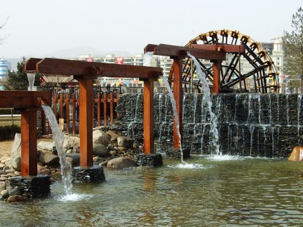 水車歷史悠久,外形奇特,起源于明朝,是蘭州市古代黃河沿岸最古老的提灌工具。蘭州水車,又叫“天車”、“翻車”、“灌車”、“老虎車”,園內(nèi)由雙輪水車、圍堰、水磨坊服務(wù)室和游樂(lè)區(qū)組成,立于黃河南岸,旺水季利用自然水流助推轉(zhuǎn)動(dòng);枯水季則以圍堰分流聚水,通過(guò)堰間小渠,河水自流助推。當(dāng)水流自然沖動(dòng)車輪葉板時(shí),推動(dòng)水車轉(zhuǎn)動(dòng),水斗便舀滿河水,等轉(zhuǎn)至頂空后再傾入木槽,源源不斷,流入園地,以利灌溉。水車園再現(xiàn)了水車這種古老的水利機(jī)械,可以使中外游人一睹為快。
