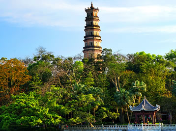 泗洲塔位于廣東惠州西湖西山,是湖上最古老建筑物。始建于唐中宗年間,為紀(jì)念泗洲大圣僧伽而筑,北宋文學(xué)家蘇軾謫居惠州時(shí)稱之為大圣塔。明嘉靖四十三年(1564年)塔毀,明萬(wàn)歷初年改建亭,明萬(wàn)歷四十六年(1618年)復(fù)建塔。光緒初年,雷破塔頂一角,長(zhǎng)了一株榕樹(shù),清代愛(ài)國(guó)詩(shī)人丘逢甲詩(shī)云:“行人欲問(wèn)朝云墓,看取亭亭塔頂榕”。山上綠樹(shù)成蔭,亭廊排映,景色秀麗。蘇東坡寫的《江月五首》“一更山吐月,玉塔臥微瀾”的著名詩(shī)句指的正是此塔。泗洲塔明代后建至今,已有整整403年古老歷史,是惠州現(xiàn)保存最完善古老的珍貴建筑物之一;葜葶糁匏粡V東省人民政府批準(zhǔn)并公布為第八批廣東省文物保護(hù)單位。
