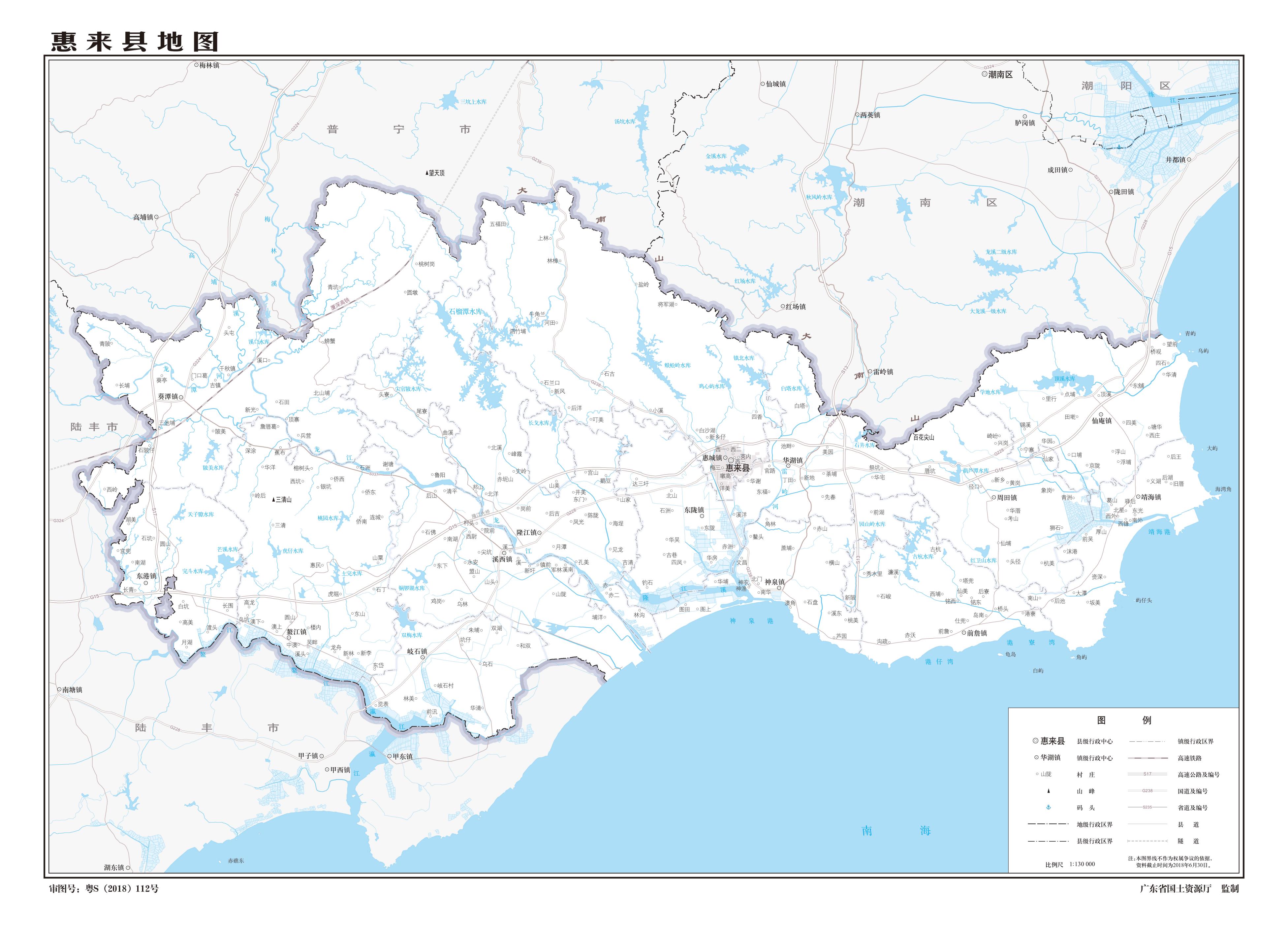 位置境域 惠來縣地處廣東省東南部,位于東經(jīng)22°53′30″~23°11′10″,北緯115°54′55″~116°34′10″之間,東連潮陽,西接陸豐,北鄰普寧,南瀕南海?h境東西相距67公里,南北相距33.5公里,全縣陸地面積1253平方公里。