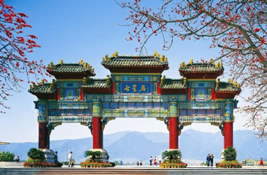 肇慶七星巖牌坊,在肇慶星湖最南面,即現(xiàn)牌坊廣場正前方,下有寬闊的大理石平臺和臺階式步級,前面與端州路交界,正對繁華的天寧北路,后面是寬闊的廣場與浩瀚似海的星湖。1959年落成,鋼筋混凝土仿古建筑,高12米,寬17.5米,四柱三間,柱礎(chǔ)花籃形,四根大圓柱飾以朱紅,仿歇山頂,上蓋琉璃瓦,中門上方鑲嵌著朱德于1959年手書的“七星巖”三個大字,為肇慶的重要標(biāo)志物。