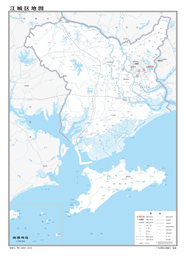 位置境域 江城區(qū)位于陽(yáng)江市南部,地理坐標(biāo)為北緯21°39′35″—21°57′27″,東經(jīng)111°47′12″—112°03′12″,東面和北面與陽(yáng)東縣毗鄰,西北與陽(yáng)春市接壤,西接陽(yáng)西縣,南臨南海,面積437.62平方公里。