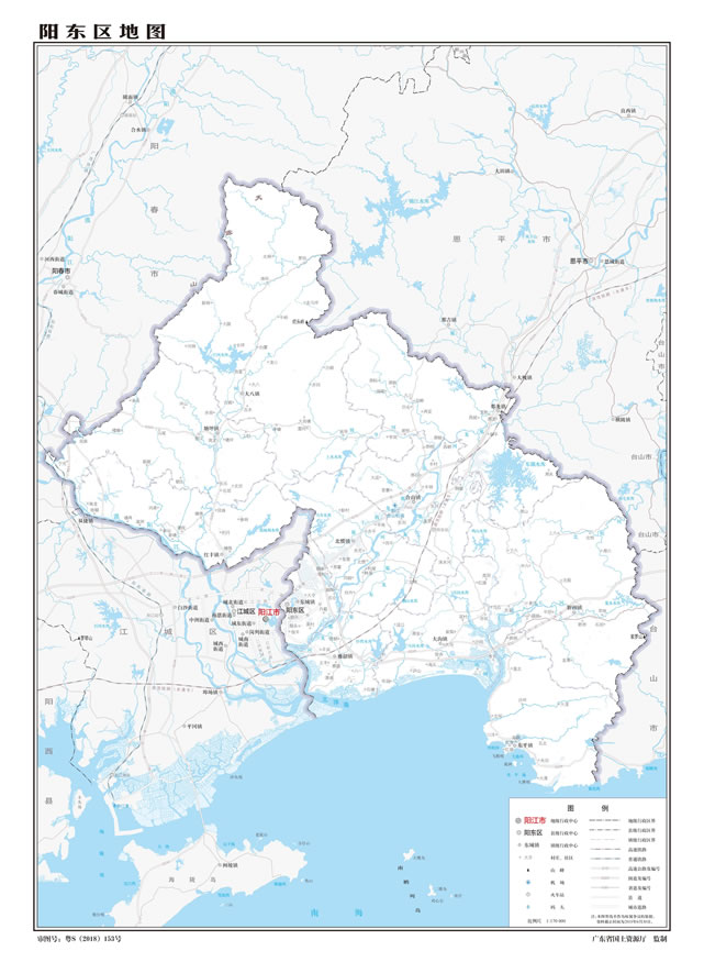 位置境域 陽東區(qū)位于廣東省西南沿海、珠江三角洲西緣,地處東經(jīng)111゜42ˊ-112゜21ˊ,北緯21゜42ˊ-22゜15ˊ。東連廣東省臺山市、恩平市,西鄰江城區(qū),北接陽春市,背山面海,南臨南海,海岸線長達130多公里。轄區(qū)面積1830平方公里。