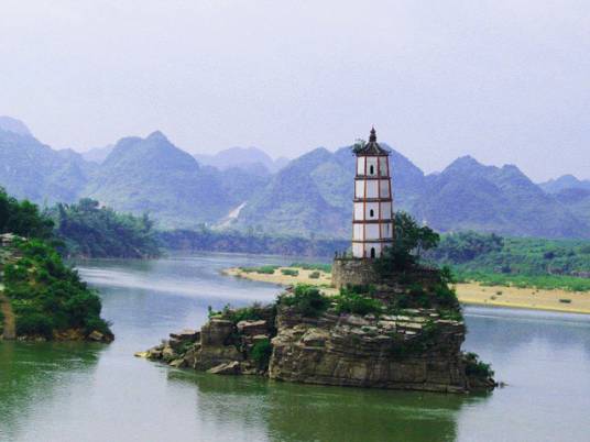 左江斜塔又名歸龍塔、水寶塔、歪塔,古稱鎮(zhèn)海寶塔,是世界八大斜塔之一,位于崇左縣城東北二千米處左江中的鱉頭山上。該塔建于明朝天啟元年(公元1621年),始建三層。清康熙三十五年(公元1696年)續(xù)建二層,為五層磚塔。塔底直徑5米,塔高18.28米,塔身呈八面體,塔頂置圓形鐵鍋一口。東西面砌磚數(shù)相差兩塊,故整座塔呈傾斜狀態(tài)。傾斜方向?yàn)槲髂掀?2°16′30″,傾斜度為4°24′64″,斜向與江水的流向正好相逆。