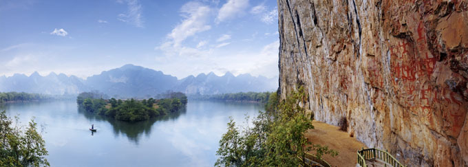 位于縣城西北25千米的明河畔,以其古老神奇的巖畫而聞名中外;ㄉ綆r畫是左江流域巖畫中的代表,也是世界同類巖畫中單位面積最大、畫面最集中、內(nèi)容最豐富、保存最完好的一處巖畫,被譽為是壯族文化的瑰寶。