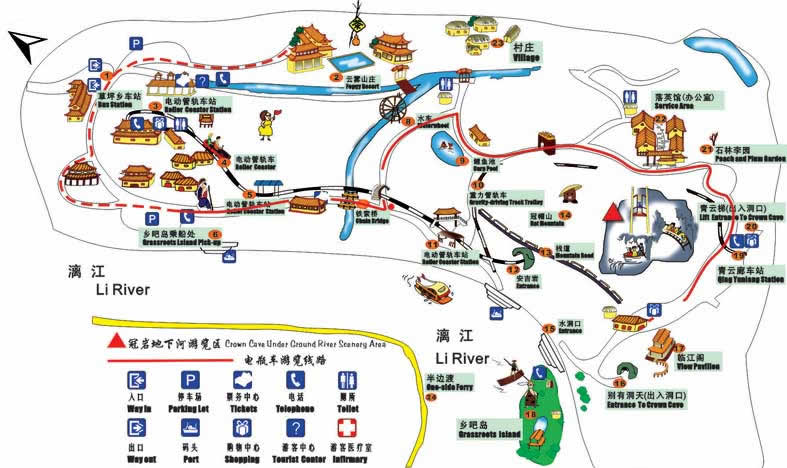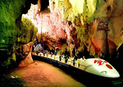 冠巖地下河游覽區(qū)是桂林有名的旅游溶洞之一,本世紀(jì)九十年代初,桂林華之冠旅游開發(fā)有限公司對冠巖進(jìn)行了全方位科學(xué)合理性的開發(fā),按高起點、高標(biāo)準(zhǔn)設(shè)計建立了多種游覽方式,洞內(nèi)共有5種游覽方式:步行(行程約1000米);乘坐觀光滑道(洞內(nèi)滑道來回約500米);乘觀光電梯(電梯高約36米,亞洲觀光第一梯),乘坐洞內(nèi)小火車(小火車長約30米,可載客108人,行程約500米);在地下河浮橋中漫步(行程約500米,洞中有世界巖洞第一瀑,地下河瀑布)。多種現(xiàn)代游覽設(shè)施與洞內(nèi)景色相輔相成,使冠巖成為國內(nèi)獨具特色和韻味的水陸空游覽洞穴。
