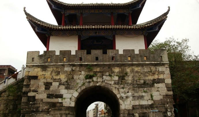 德勝古城 位于德勝街西約1公里許,亦稱河池守御千戶所遺址。明洪武二十八年(1395)置河池守御千戶所于河池州,以扼七十二峒之沖,隸慶遠衛(wèi)。永樂六年(1408)遷至德勝。城呈長方形,東西寬500米,南北長1000米,四面有城門和城樓,現(xiàn)僅存東門城樓。樓高8米,長11米,城門高3.5米,寬3.4米,均為細鑿料石基礎(chǔ),墻為明代青方磚,甚為壯觀。