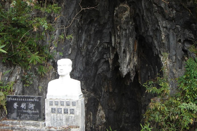 香刷洞位于西山鄉(xiāng)弄列村東北部的一座半山坡上,香刷洞為石灰?guī)r溶洞,洞口高5米,深10米,寬約6米,洞底型似臥底,洞中一年四季比較干燥,洞內(nèi)可容納20多人。洞內(nèi)右側(cè)一高處有一平臺,可以臥人,臺左側(cè)有一小洞穴可以匍伏出洞外。民國21年間(1932年)10月19日晚,堅(jiān)持在右江斗爭的中國工農(nóng)紅軍獨(dú)立第三師師長韋拔群在戰(zhàn)略轉(zhuǎn)移中隱藏在此洞中,不幸被叛徒韋昂殺害,犧牲時(shí)僅38歲。香刷洞是巴馬瑤族自治縣縣級重點(diǎn)文物保護(hù)單位。