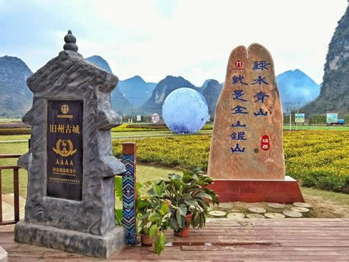舊州景區(qū)位于廣西壯族自治區(qū)靖西市市區(qū)以南8公里,四面被喀斯特地貌群山層層環(huán)抱,古城在兩條河流的匯集處依水而建,年平均氣溫19.9℃,四季宜人。“山水賽桂林,氣候似昆明”,人文古跡眾多,壯族風(fēng)情濃郁,素有“壯族活的博物館”之美譽(yù)。2018年成功評(píng)定為國(guó)家AAAA級(jí)景區(qū)。