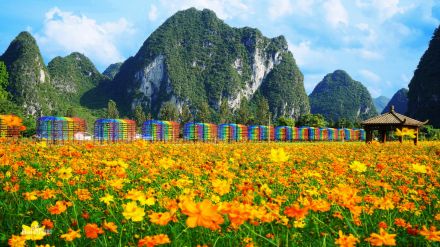 千畝錦繡花海舊州古城東山腳下,綿延千畝的種植區(qū)內(nèi)花卉、稻田、季節(jié)性花樹(shù)、觀賞性苗木錯(cuò)落有致,因其形似一副色彩斑斕的巨幅壯錦而得名。分布有錦繡花海區(qū)、三生桃林、山楂樹(shù)之戀、丘比特之箭、七彩風(fēng)車陣、蟾宮桂花林、紅妝楓林、不染蓮池“那”文化展示區(qū)(水稻種植區(qū)和拾趣采摘園)等花卉景觀。