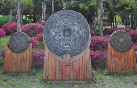 景區(qū)內(nèi)有廣西最大的銅鼓,在鼓面上,鑄造著壯人頂禮膜拜的圖騰——太陽與青蛙,壯人認為青蛙是雷神的子女,求雨就要靠青蛙。