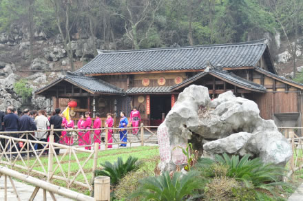 “如今廣西成歌海,都是三姐親口傳”。劉三姐是傳說中的壯族歌仙,她以山歌為武器,與土豪莫懷仁進行了針鋒相對的斗爭。景區(qū)內(nèi)的豪宅就是莫懷仁居住的莫府。莫府坐北朝南,東青龍,左傍蒼翠秀美的西山;西白虎,右依靈氣生生的踩月山;南朱雀,前環(huán)美麗的桃花江;北玄武,背靠徐霞客記載過的獅子峰。