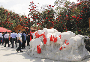 金坡祭祀花神主題園,這里神奇古怪的雕刻,講述了遠古的彝山人祭祀花神的傳統(tǒng)習俗,展現(xiàn)了從古至今這里各族人民崇拜花神,敬供花神,祭祀花神的生動傳承寫照,高處有花神瑪依魯?shù)膲,位前有九種絢麗不同的顏色的杜鵑花,壇前有三牲祭祀貢品。有擊鼓手在擊鼓,旁有千里眼、順風耳在觀察東西南北天象,聽聞四面八方民情。