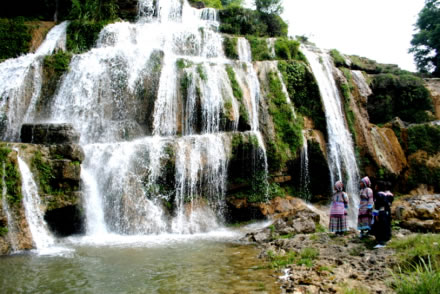 這里離米底河瀑布約一公里,突然泄入約500米的溶洞。經(jīng)過天生橋、天窗眼又流進“摩天大樓”下變?yōu)榉,這里呈現(xiàn)的是只聞其聲、不見其影,然后從一線天大峽谷涌出,頗有亂石穿空,驚濤拍岸的雄奇氣勢。