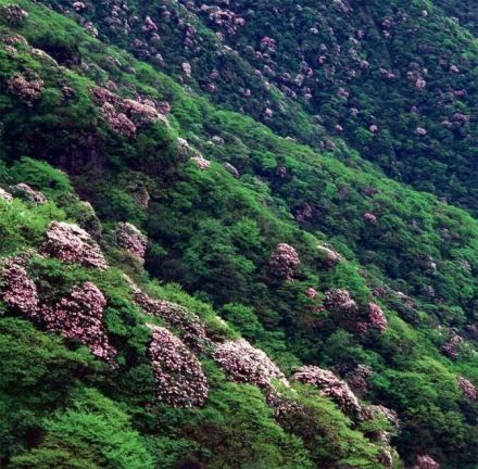 百里杜鵑林帶呈環(huán)狀分布,延綿50余公里,寬約1~3公里。有馬纓杜鵑、大白花杜鵑、水紅杜鵑、露珠杜鵑等41個品種,占世界杜鵑花5個亞屬中的全部;ㄉ鄻,絢爛生輝。每年3月中下旬到4月底次第開放,百里花山色彩繽紛,猶如廣袤的錦緞華章鋪山蓋嶺,百態(tài)千姿。被譽為“世界上最大的天然花園”。