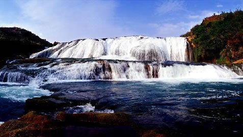 “遙聞水聲轟轟,從隴隙北望,忽有水自東北山腋瀉崖而下,搗入重淵,但見其上橫白闊數(shù)丈,翻空涌雪,而不見其下截,蓋為對崖所隔也。”這是徐霞客在《徐霞客游記》中對陡坡塘瀑布的描述。陡坡塘瀑布因1985年曾在該瀑布拍攝電視連續(xù)劇《西游記》序曲《敢問路在何方》中,唐僧師徒四人牽馬過河的場景而聲名遠播。