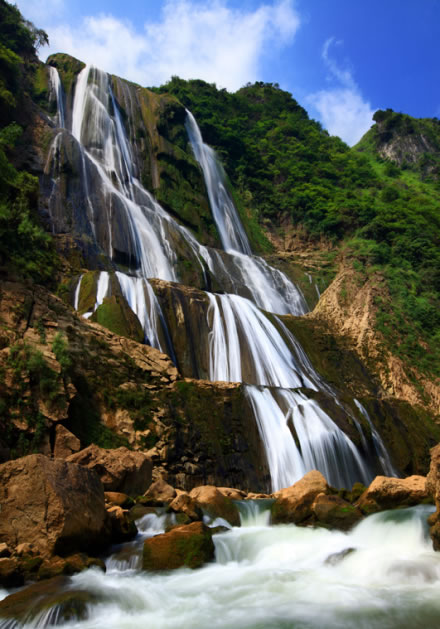 滴水灘瀑布位于黃果樹瀑布以西8公里,總高度和個體都為黃果樹瀑布群之首。這里兩山對峙,東為大坡頂,西為關索嶺,中間是深達700米的霸陵河峽谷,瀑布就掛在關索嶺大山上。滴水灘瀑布總高410米,為黃果樹瀑布的五倍,最下層134米,雄偉磅礴。