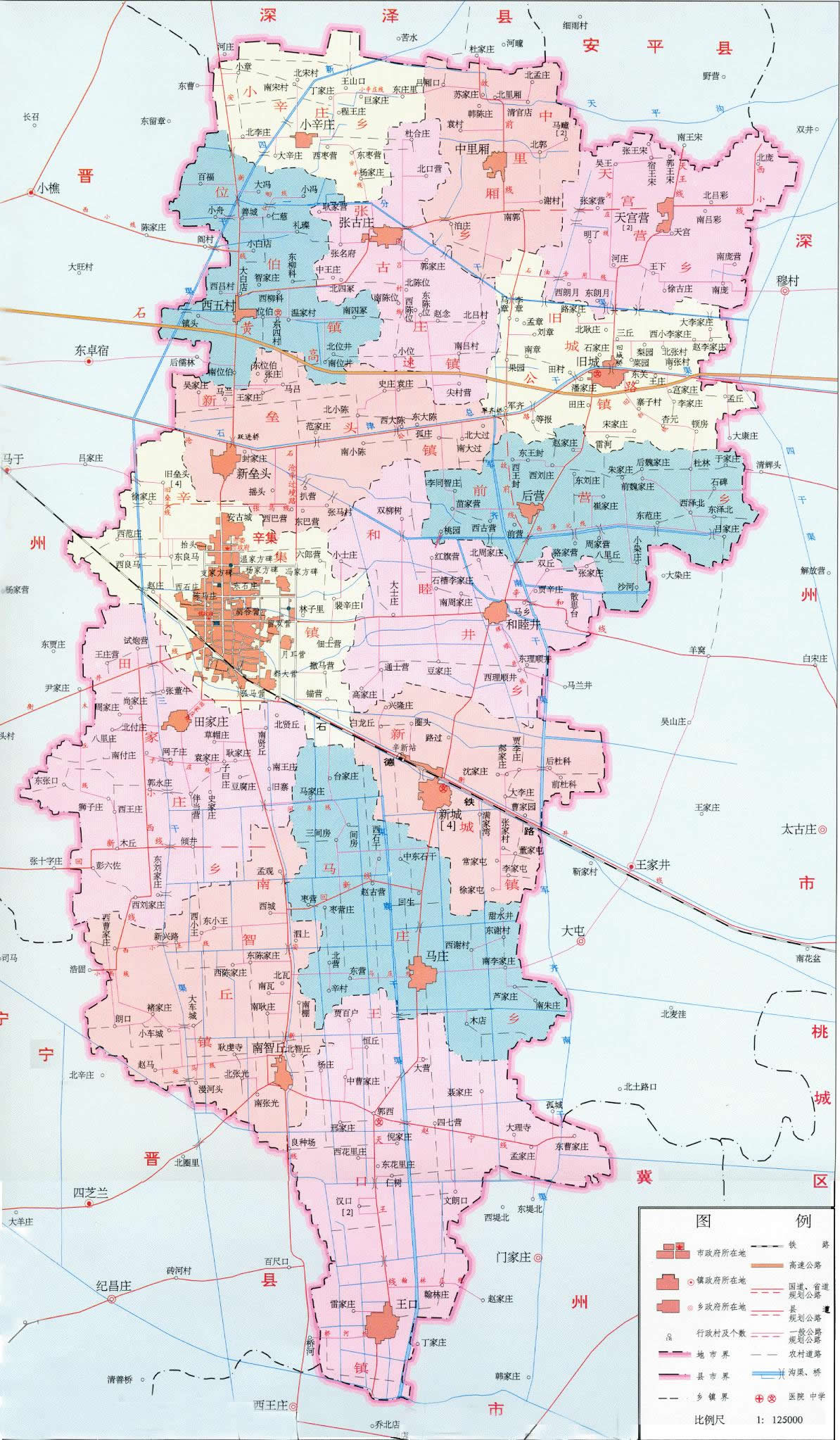 鎮(zhèn):辛集鎮(zhèn)、舊城鎮(zhèn)、張古莊鎮(zhèn)位伯鎮(zhèn)新壘頭鎮(zhèn)、新城鎮(zhèn)、南智丘鎮(zhèn)王口鎮(zhèn)