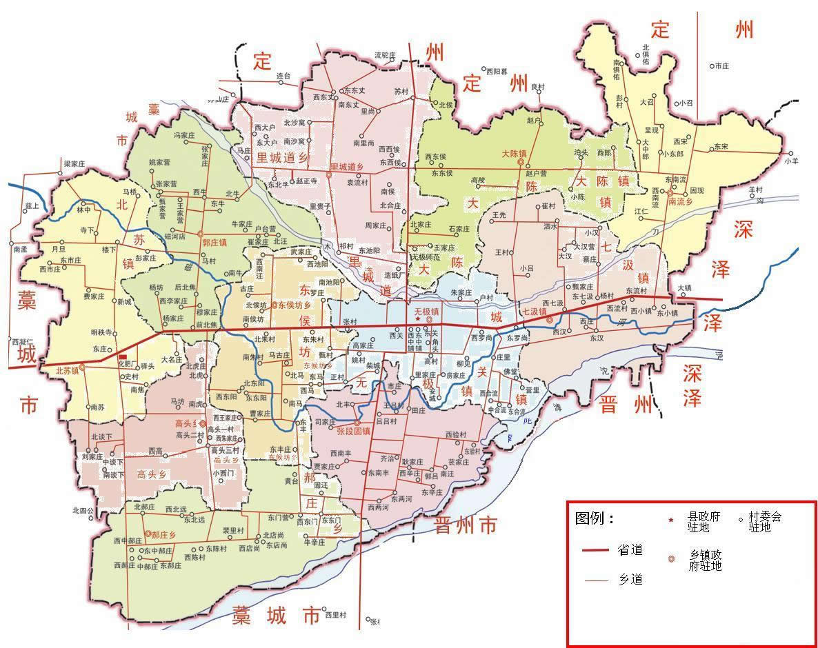 鎮(zhèn):無極鎮(zhèn)、七汲鎮(zhèn)、張段固鎮(zhèn)、北蘇鎮(zhèn)郭莊鎮(zhèn)、大陳鎮(zhèn)