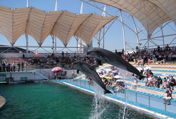 海豚表演館于2000年5月1日正式營業(yè),投資近6000萬元人民幣,占地面積約3000平方米。三面環(huán)座的看臺可同時容納2000名游客,站在看臺極目遠(yuǎn)眺,表演池和大海仿佛融為一體。在優(yōu)美音樂的伴隨下,不僅可以欣賞到海豚的水中華爾茲、空中頂球、跳圈、跨桿、環(huán)場鞠躬跳等高難度的精彩表演;還可以領(lǐng)略海獅投籃、水中霹靂舞、中國功夫等出色的演技;同時您還有機(jī)會親身觸摸海豚,與它握手交流,共同感受人與自然默契相通的美好境界。