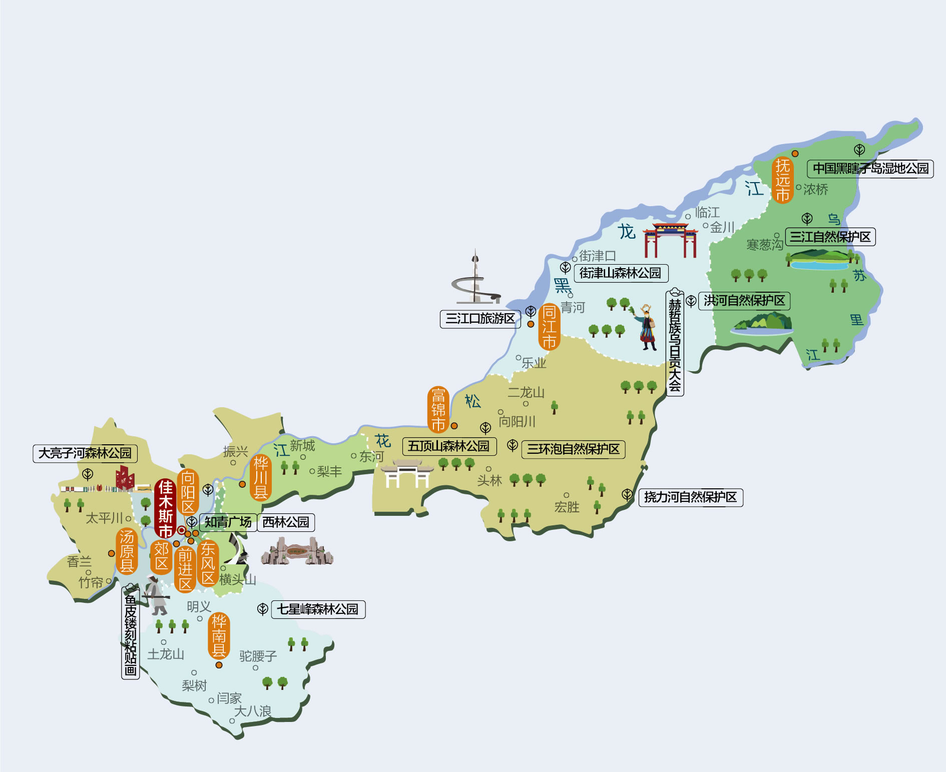 佳木斯市轄4個市轄區(qū)、3個縣,代管3個縣級市:
