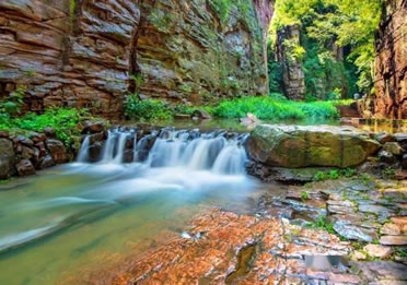 龍?zhí)洞髰{谷景區(qū)是王屋山——黛眉山世界地質(zhì)公園的核心景區(qū),是一條以典型的紅巖嶂谷群地質(zhì)地貌景觀為主的峽谷景區(qū)。谷內(nèi)關(guān)峽相望,潭瀑聯(lián)珠,壁立萬(wàn)仞,峽秀谷幽,經(jīng)過(guò)十二億年的地質(zhì)沉積和260萬(wàn)年的水流切割旋蝕所形成的高峽甕谷、山崩地裂奇觀,堪稱世界一絕,人間少有,享有“中國(guó)嶂谷第一峽”、“古海洋天然博物館”、“峽谷絕品”和“黃河水畫(huà)廊”等美名。