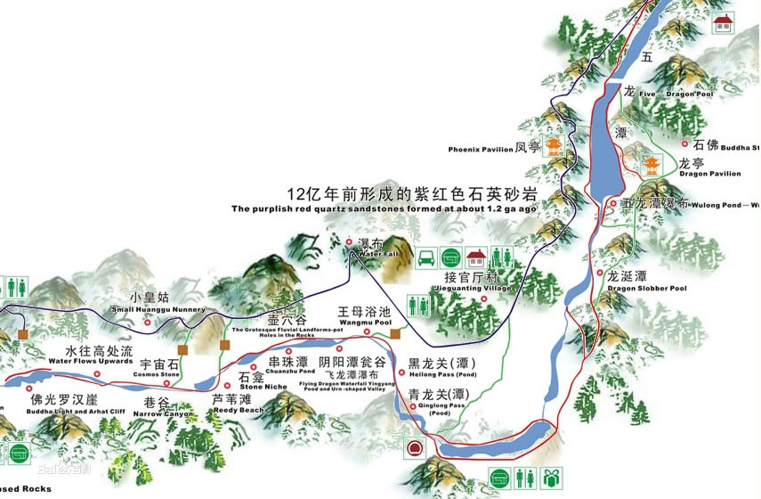 龍?zhí)洞髰{谷是一條由紫紅色石英砂巖經(jīng)流水追蹤下切形成的U形峽谷,全長(zhǎng)12公里,谷內(nèi)嶂谷、隘谷呈串珠狀分布,云蒸霞蔚,激流飛濺,紅壁綠蔭,懸崖絕壁,不同時(shí)期的流水切割、旋蝕,磨痕十分清晰,巨型崩塌巖塊形成的波痕大絕壁國(guó)內(nèi)外罕見(jiàn)。