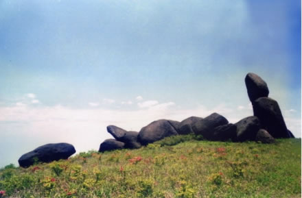 2、婦孺石:位于海拔1400米的茫茫草原之中,巍然挺拔,高約10米,上下由兩塊大小不等的石頭組成,遠觀猶似一少婦,神態(tài)慈祥,悠然自在,懷抱其子,親切可人。故名。